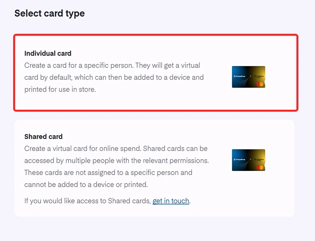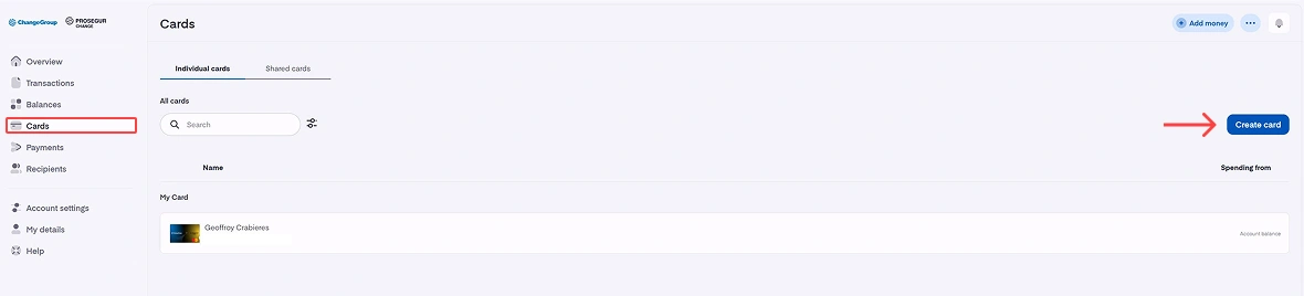 - Gå till plattformen och klicka på ”Kort”, sedan på ”Skapa kort”.